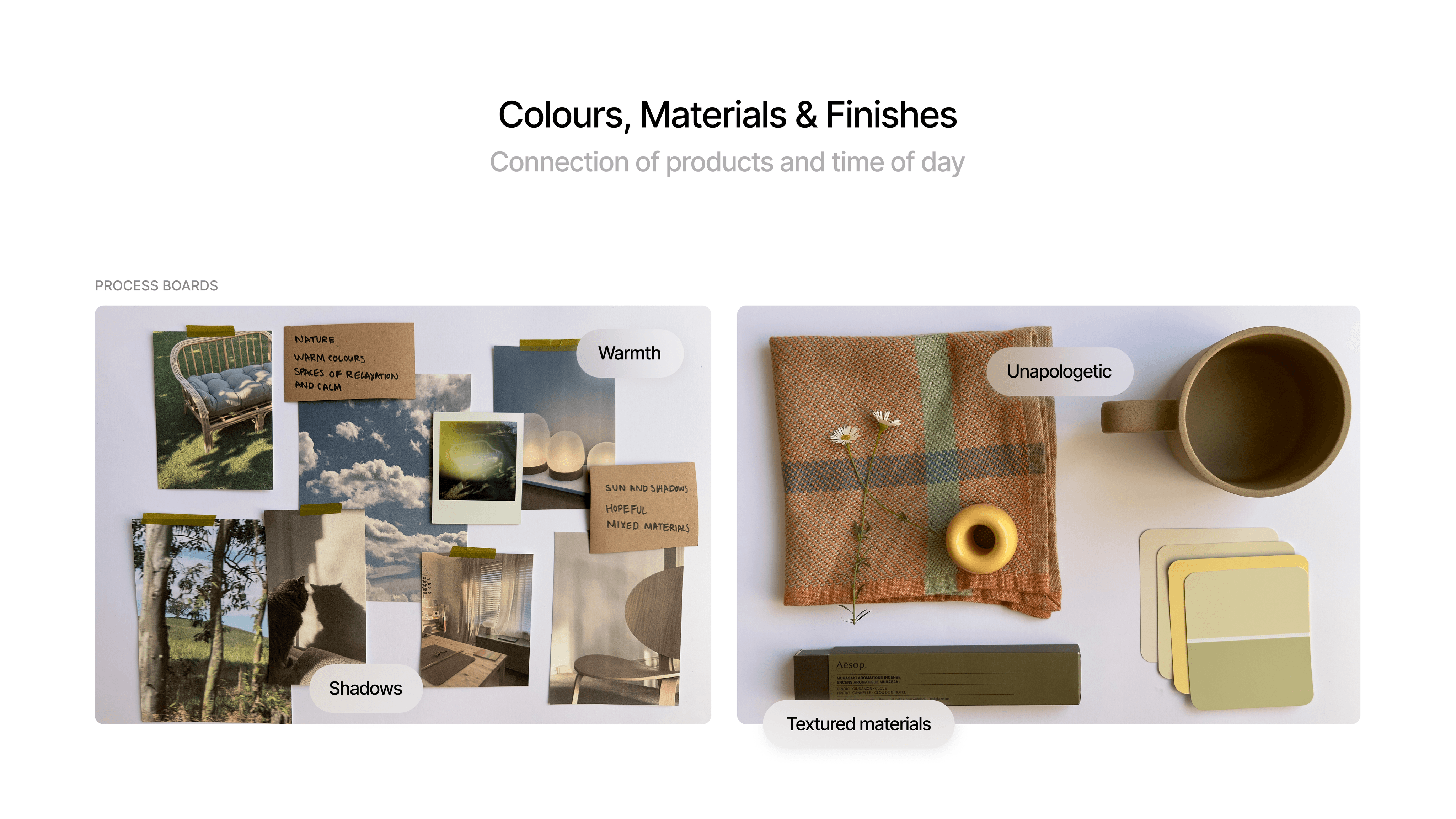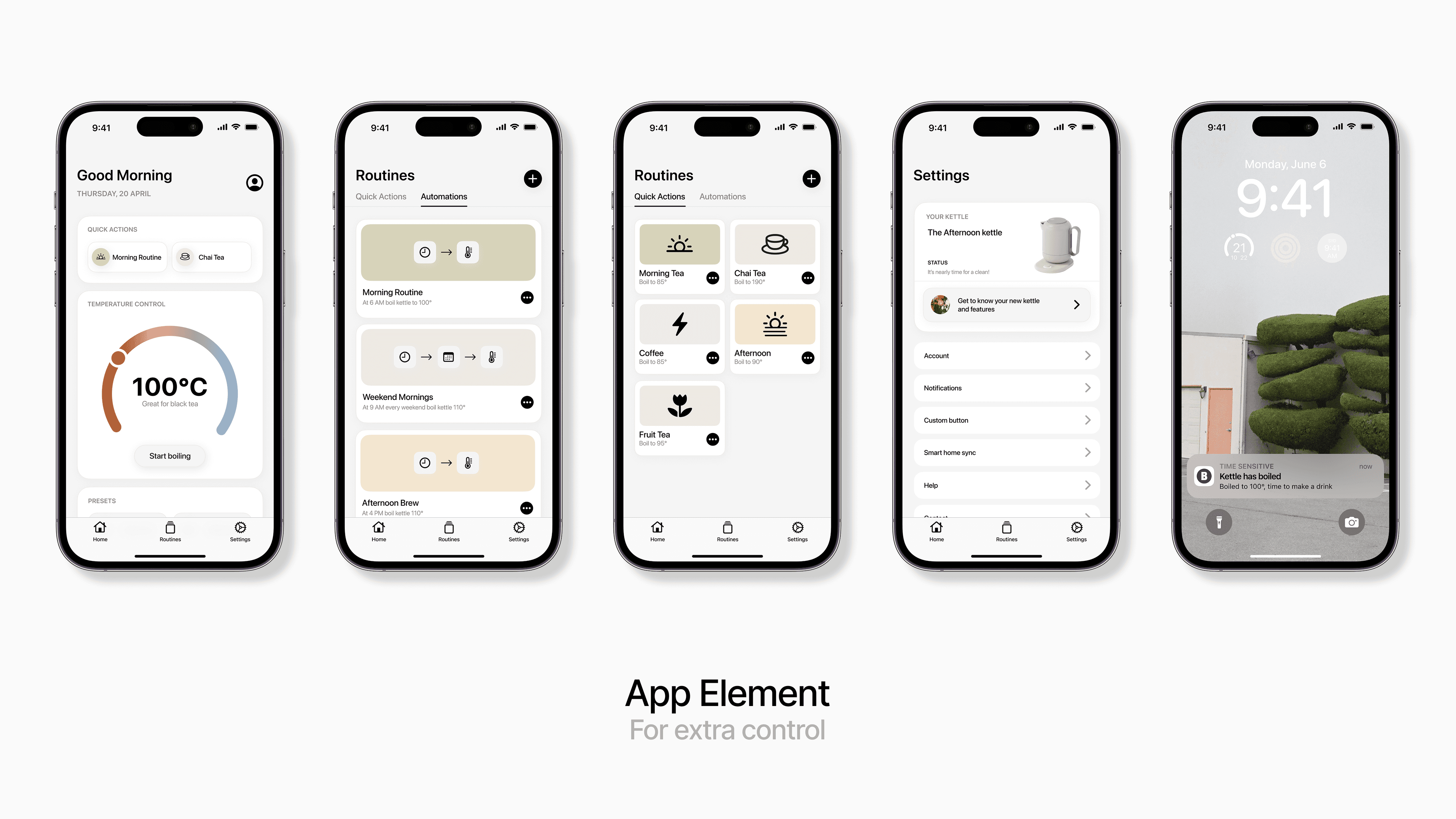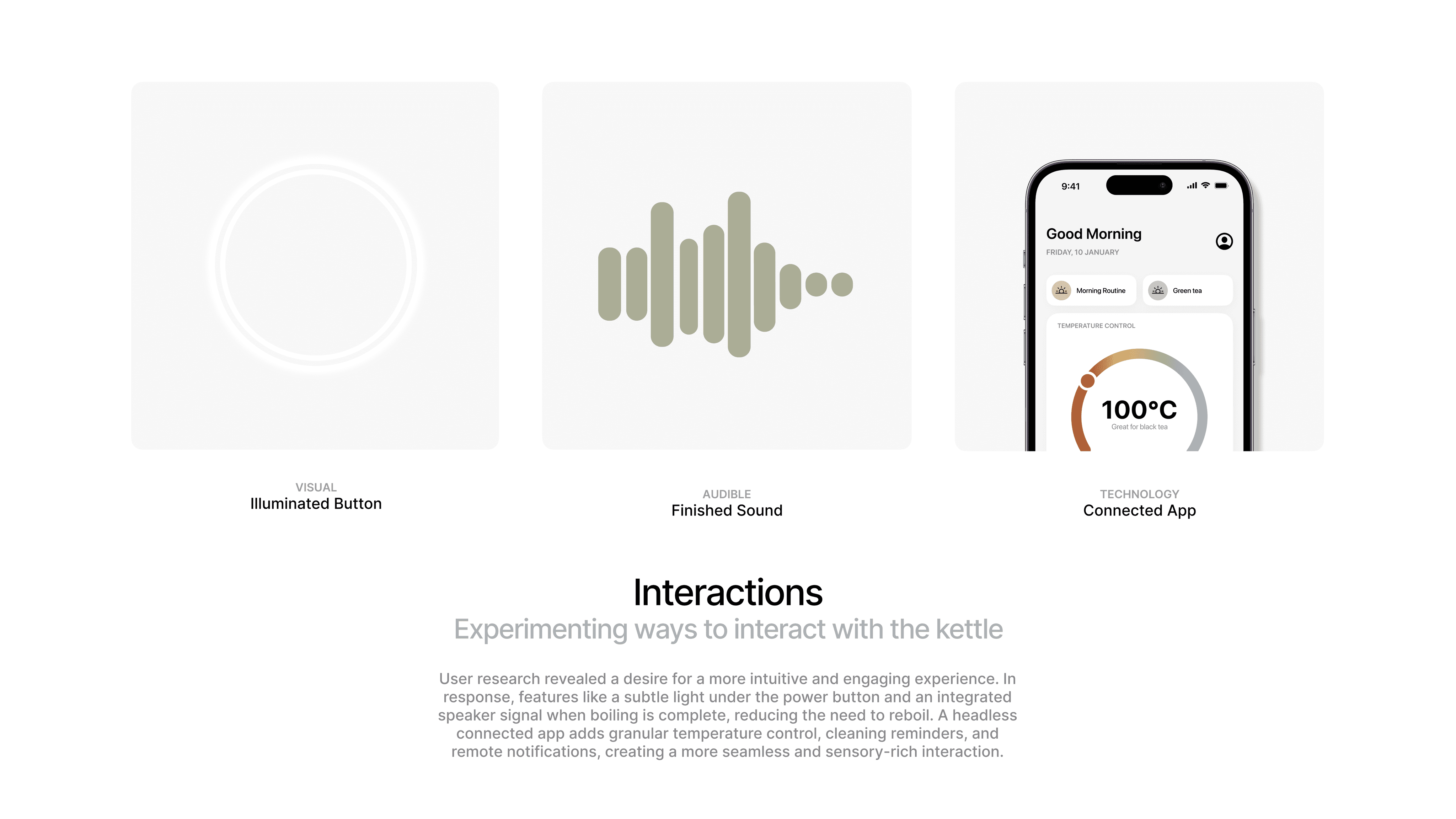 The final design pairs a timeless physical form with a subtle digital layer, allowing users to control and monitor their kettle via a companion app. Hero renders, lifestyle photography, and outdoor shots showcase the kettle in different contexts, reflecting its role as both a practical appliance and a visual accent in the home. Soft, neutral finishes and refined detailing invite daily use while creating moments of calm in the kitchen.