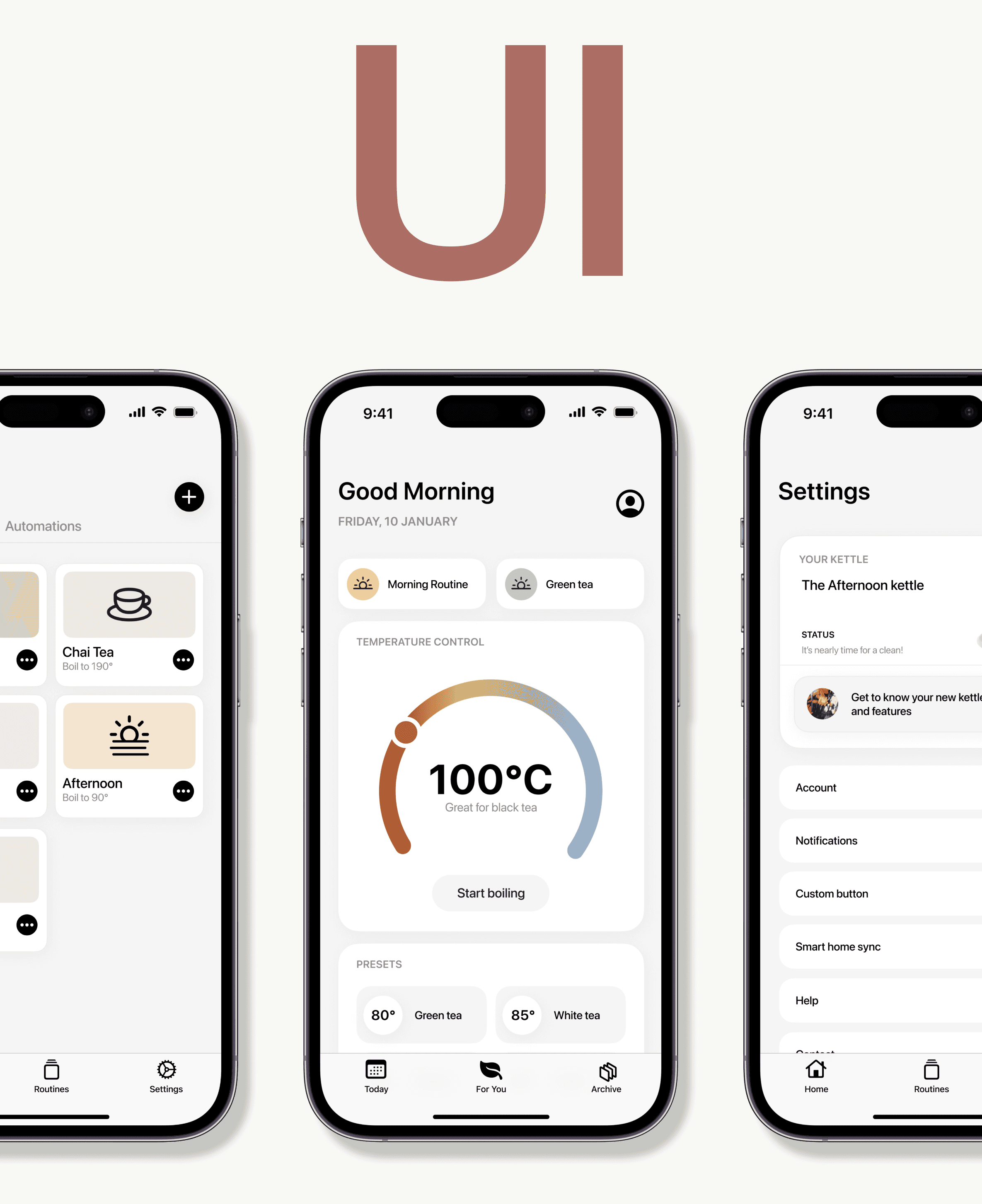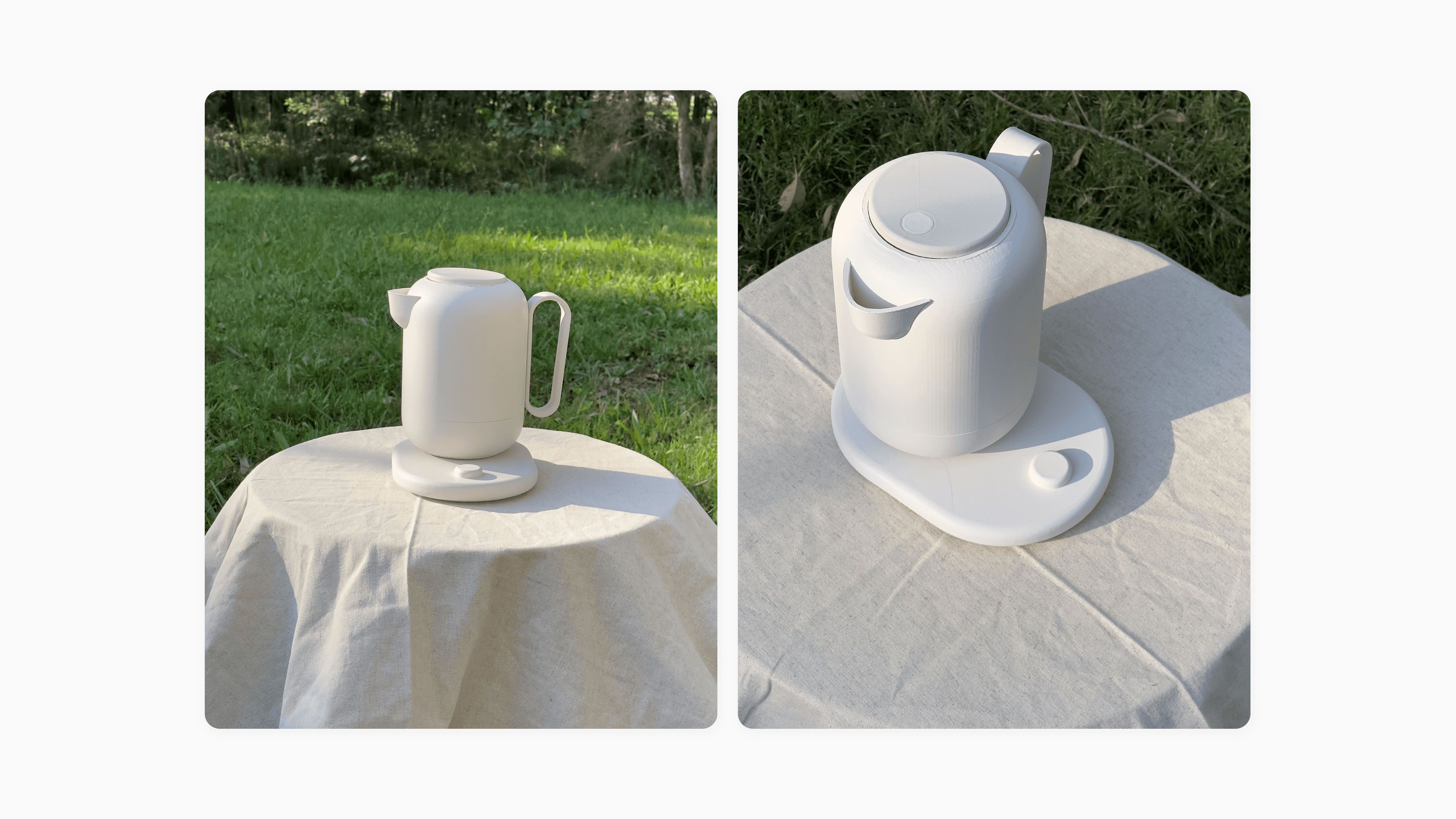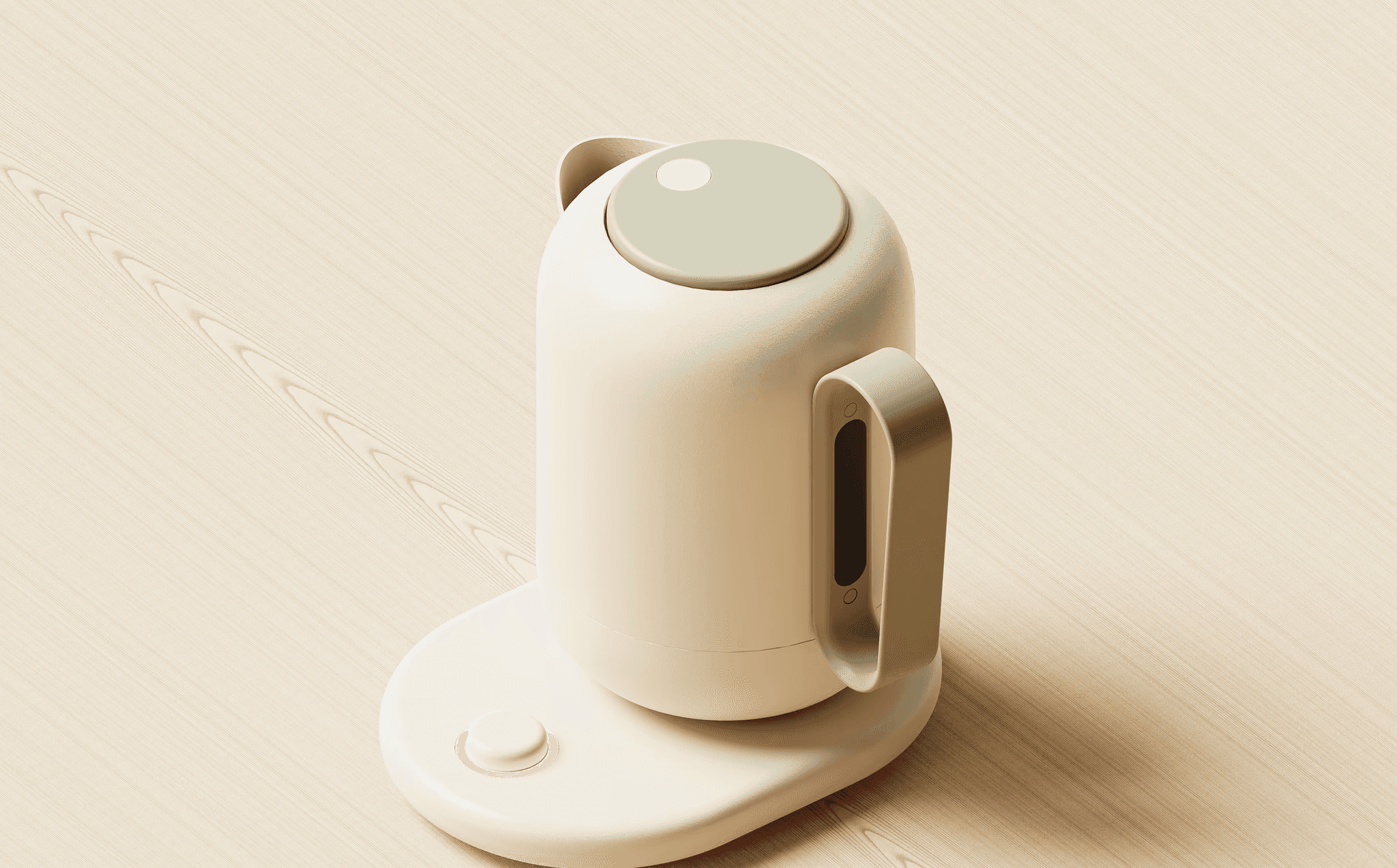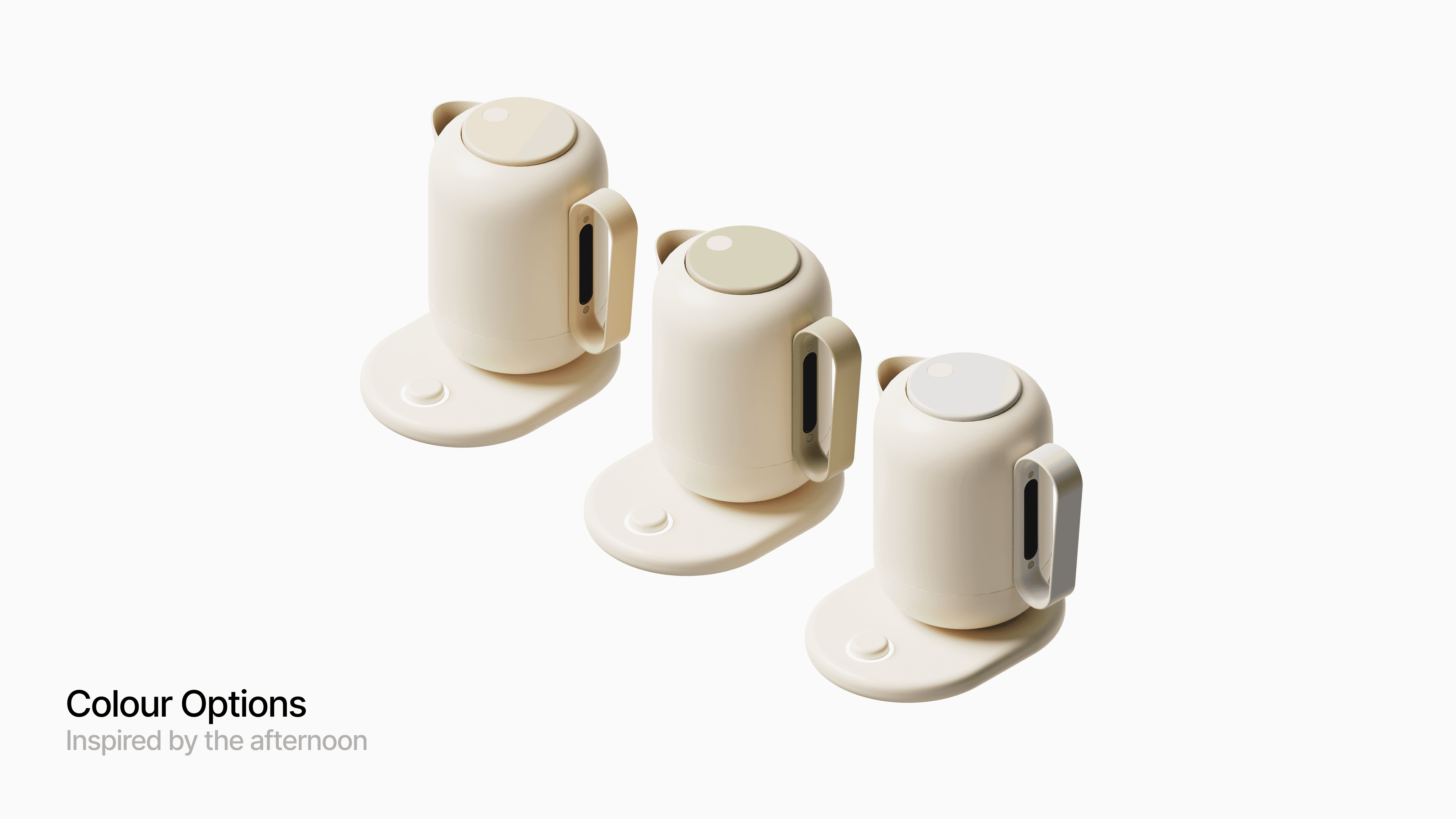 The Afternoon Kettle is a reimagining of one of the most familiar kitchen appliances, designed to turn a routine task into a calming ritual. Guided by user insights and inspired by the warm, tranquil atmosphere of late afternoon, this project blends soft, approachable forms with thoughtful digital integration. The design prioritises countertop presence, tactile comfort, and a seamless user experience, both physically and through a companion app. The result is a kettle that not only performs its function but also enhances the aesthetic and emotional quality of the home.