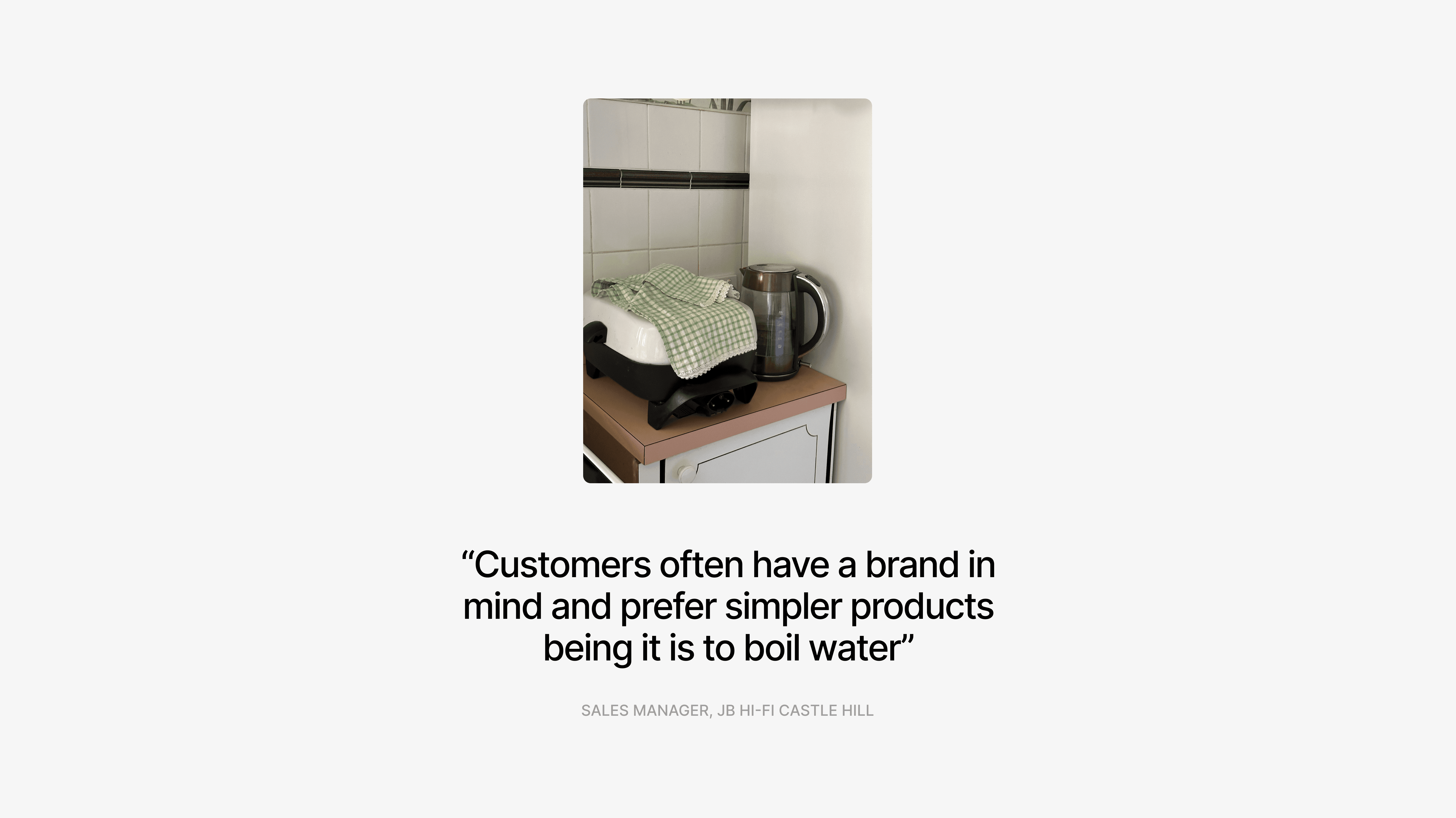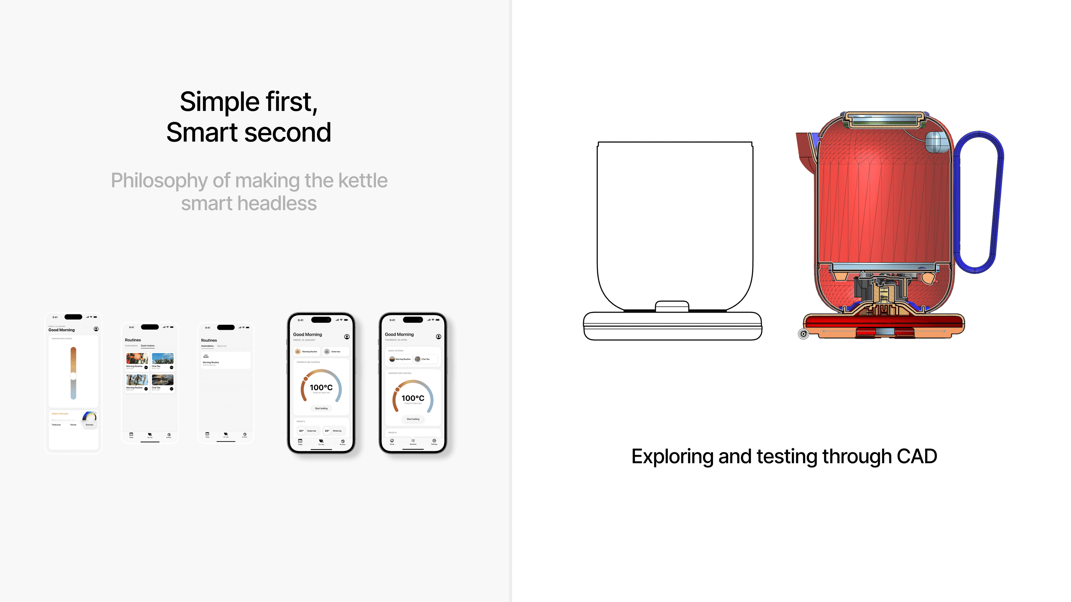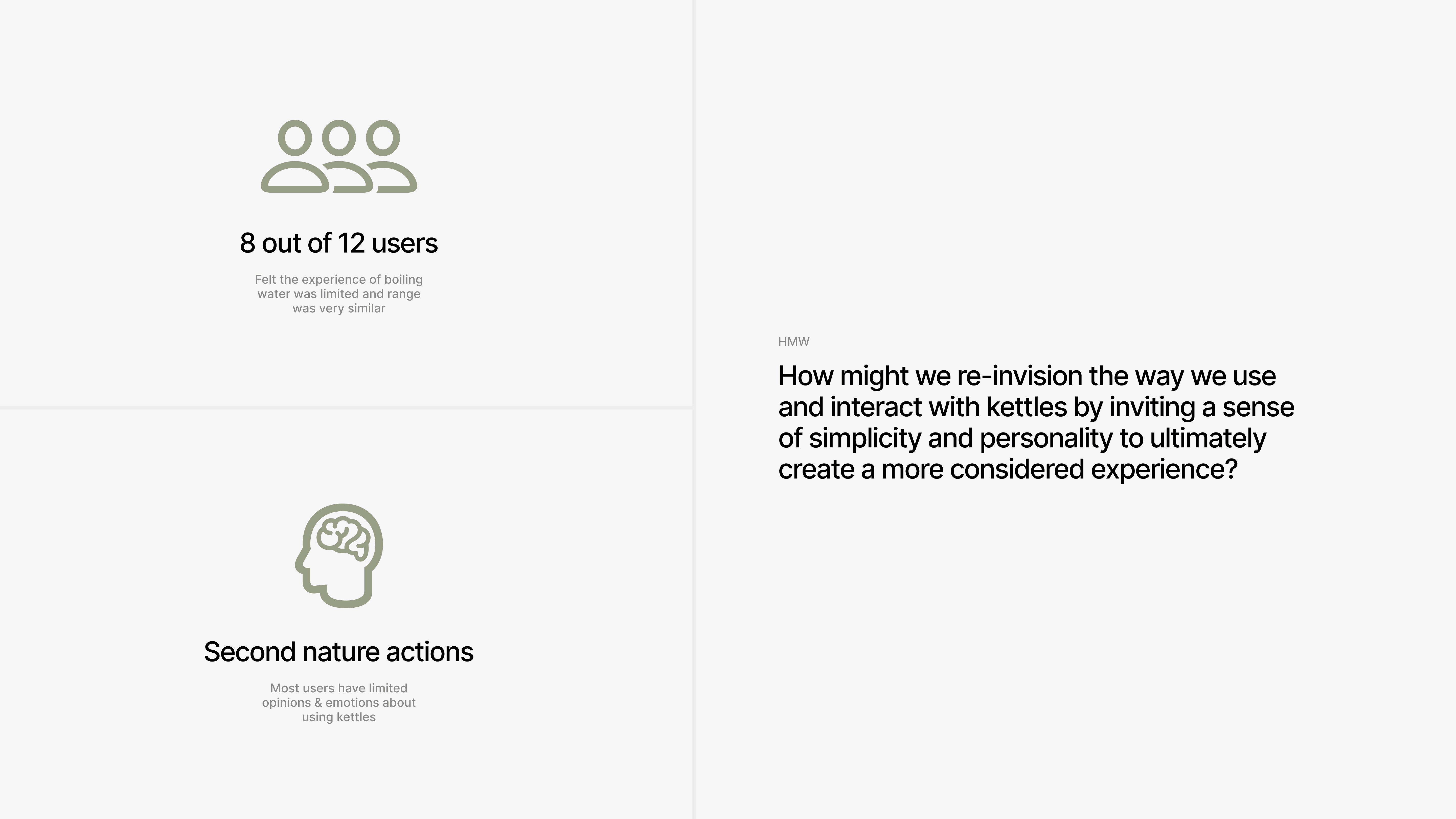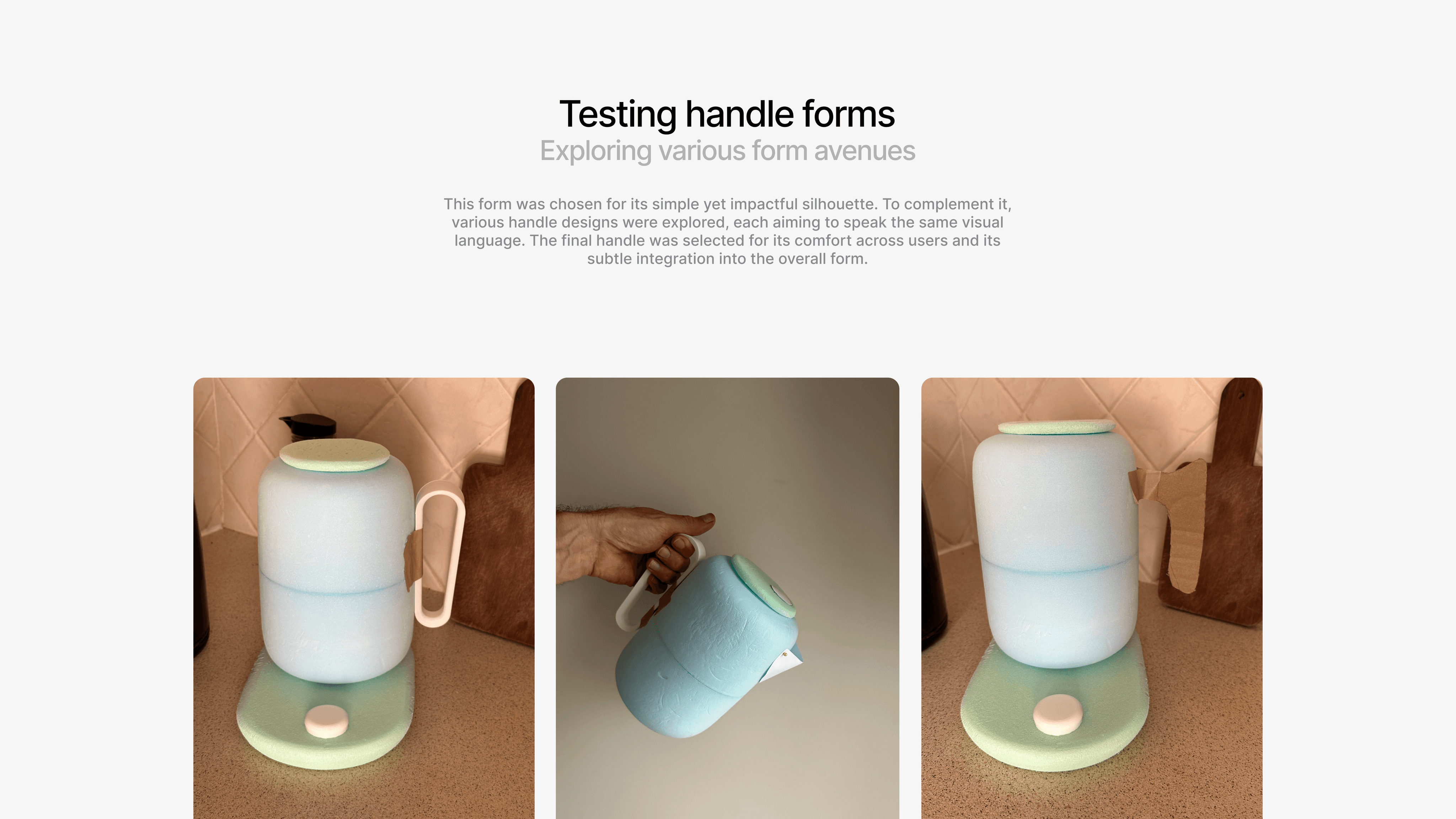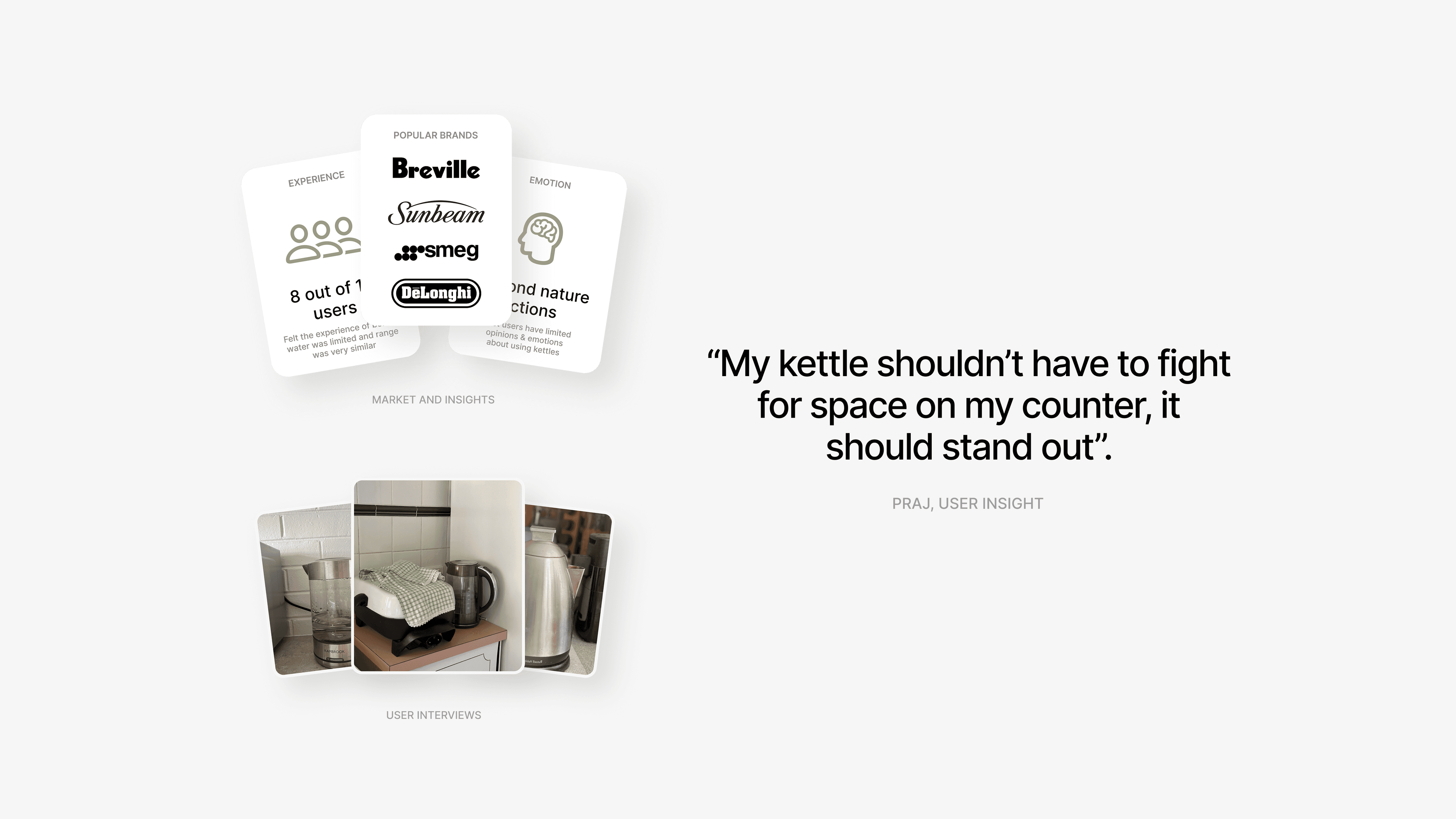 This project began with a question: what is the true ritual of boiling water, and what does it mean to those who perform it? Research into users and industry trends revealed a lack of emotional connection in the market, most kettles fail to respond to the quiet moments that surround the act. Boiling water is more than function; it’s a pause, a preparation, a connection. The goal was to design a kettle that integrates effortlessly into its surroundings, yet stands proudly on the counter, a piece the user is delighted to keep in view. It delivers practical performance while embodying the quiet emotional value of the ritual itself.