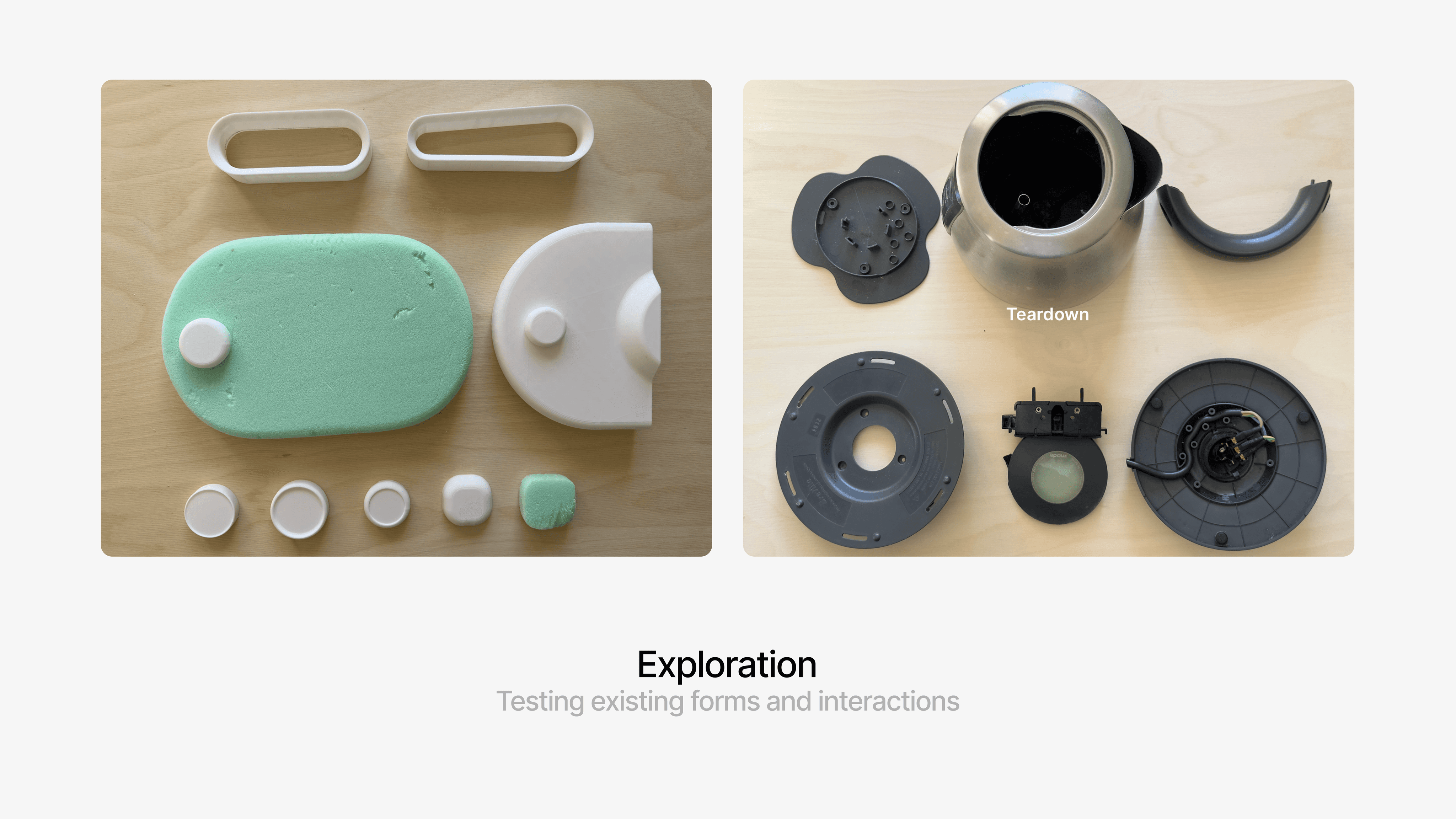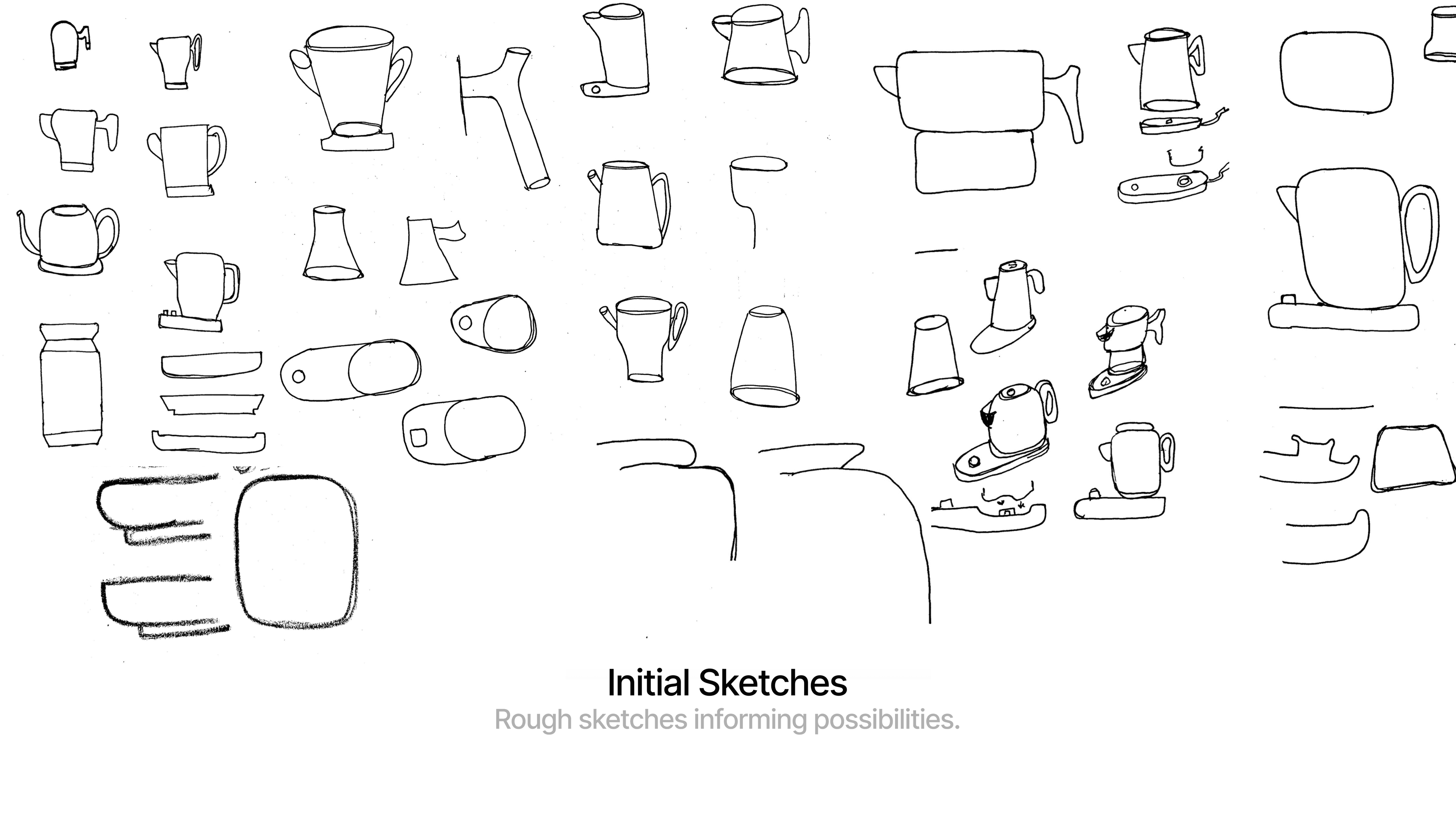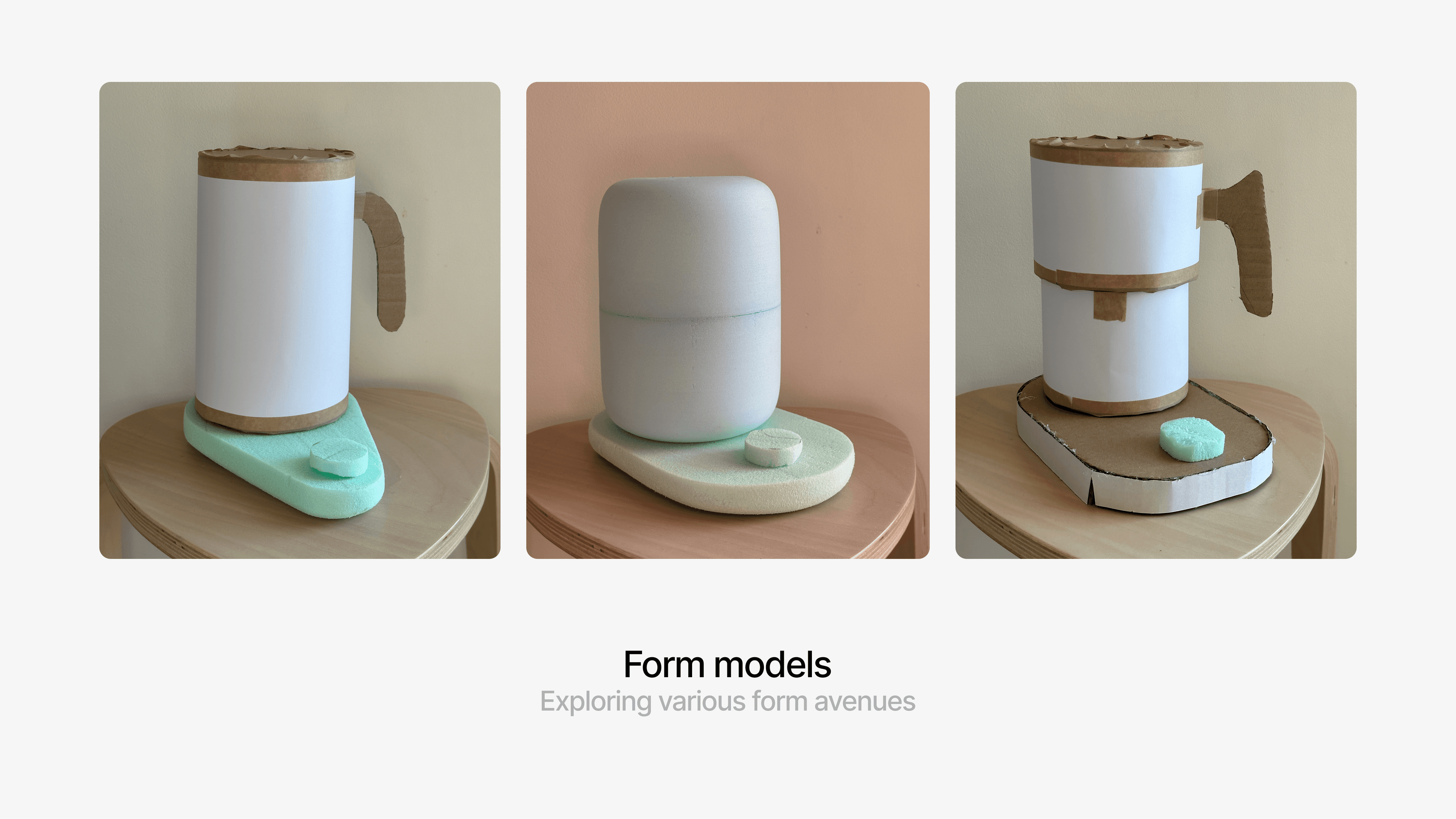 I began with rapid sketches to explore silhouette possibilities, followed by foam and CAD block models to evaluate proportions and ergonomics. Material swatches and inspiration boards guided a warm, muted palette. Interaction studies, including handle positioning, lid mechanisms, and digital controls, helped refine how users would experience the kettle physically and through a connected app but through headless system that allows the kettle to still function without the app creating a notion of "Simple first, smart second".