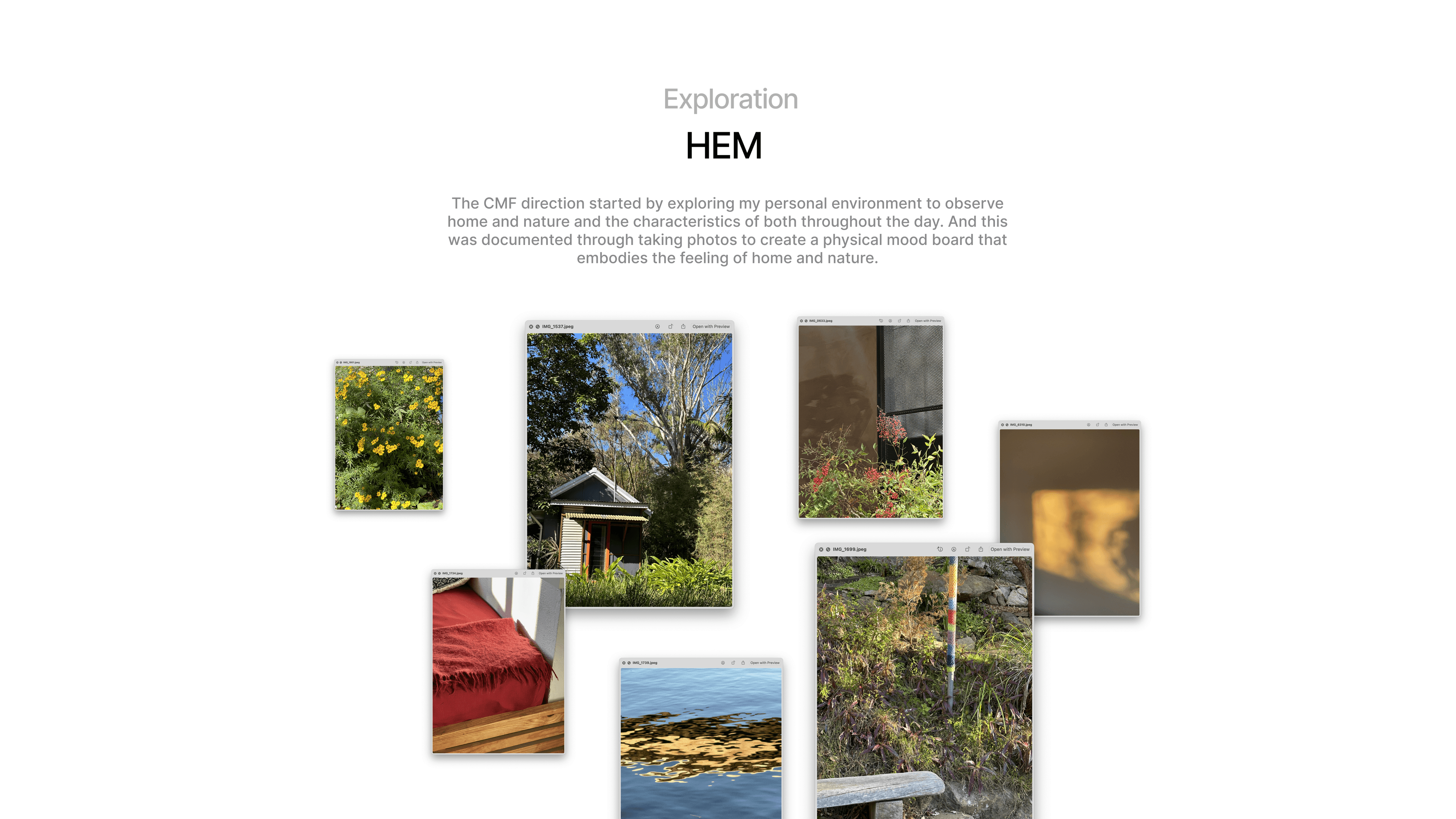 Rough drawings mapped out early possibilities, while simple form models helped evaluate proportions and presence. The CMF direction drew from my personal environment, observing the interplay between home and nature, and capturing it through photography and physical mood boards. This connection to nature became a central thread, grounding the design in forms and textures that feel both familiar and enduring.