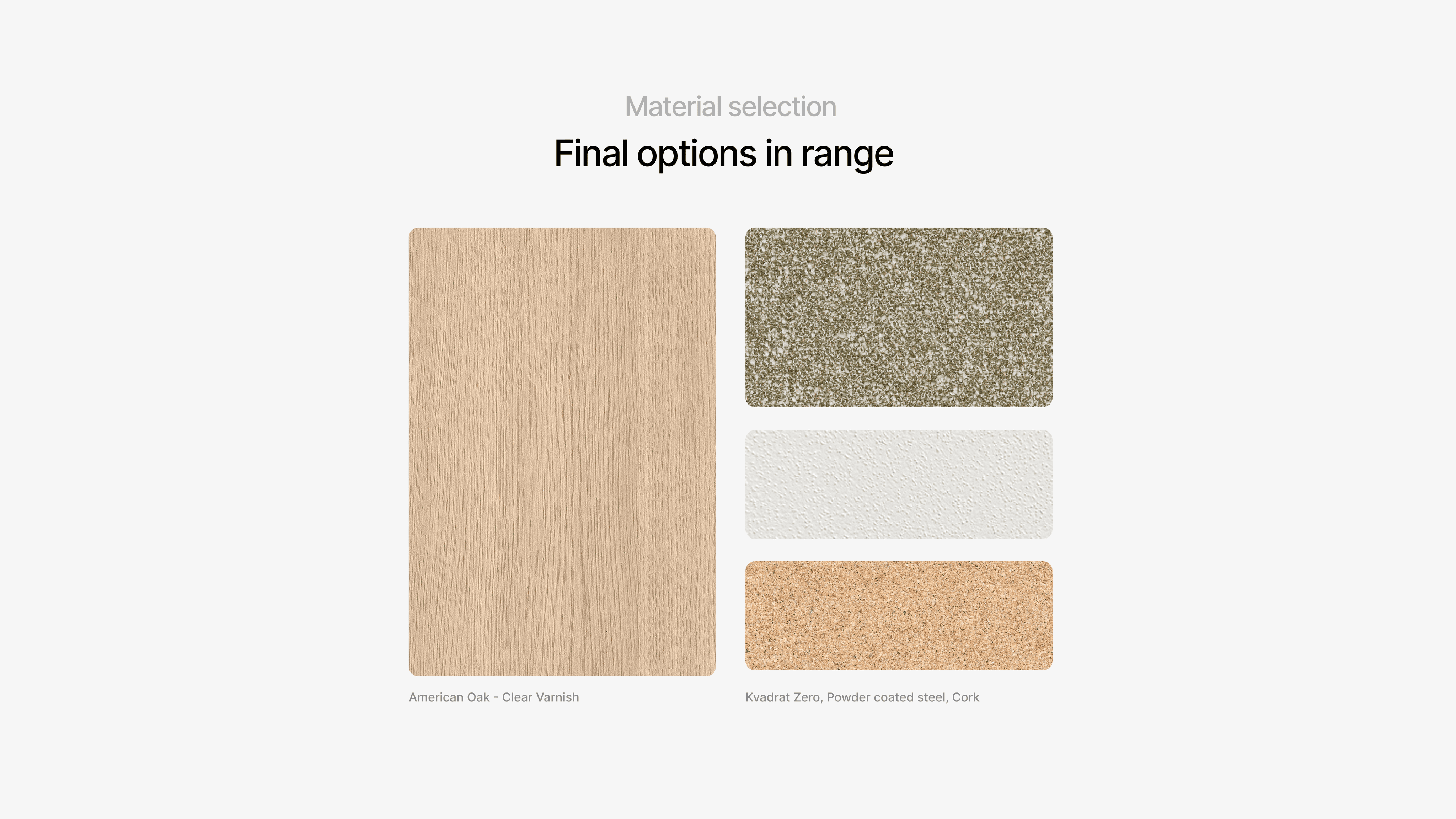 Scale models were used to refine proportions, while user feedback guided the CMF palette, focusing on what felt calming, timeless, and worth keeping. Material testing explored how each surface influenced emotional response, leading to a considered combination of American Oak, Kvadrat Zero upholstery, powder-coated steel, and cork. Cushion prototypes ensured a seamless connection between modular elements, balancing comfort with adaptability.